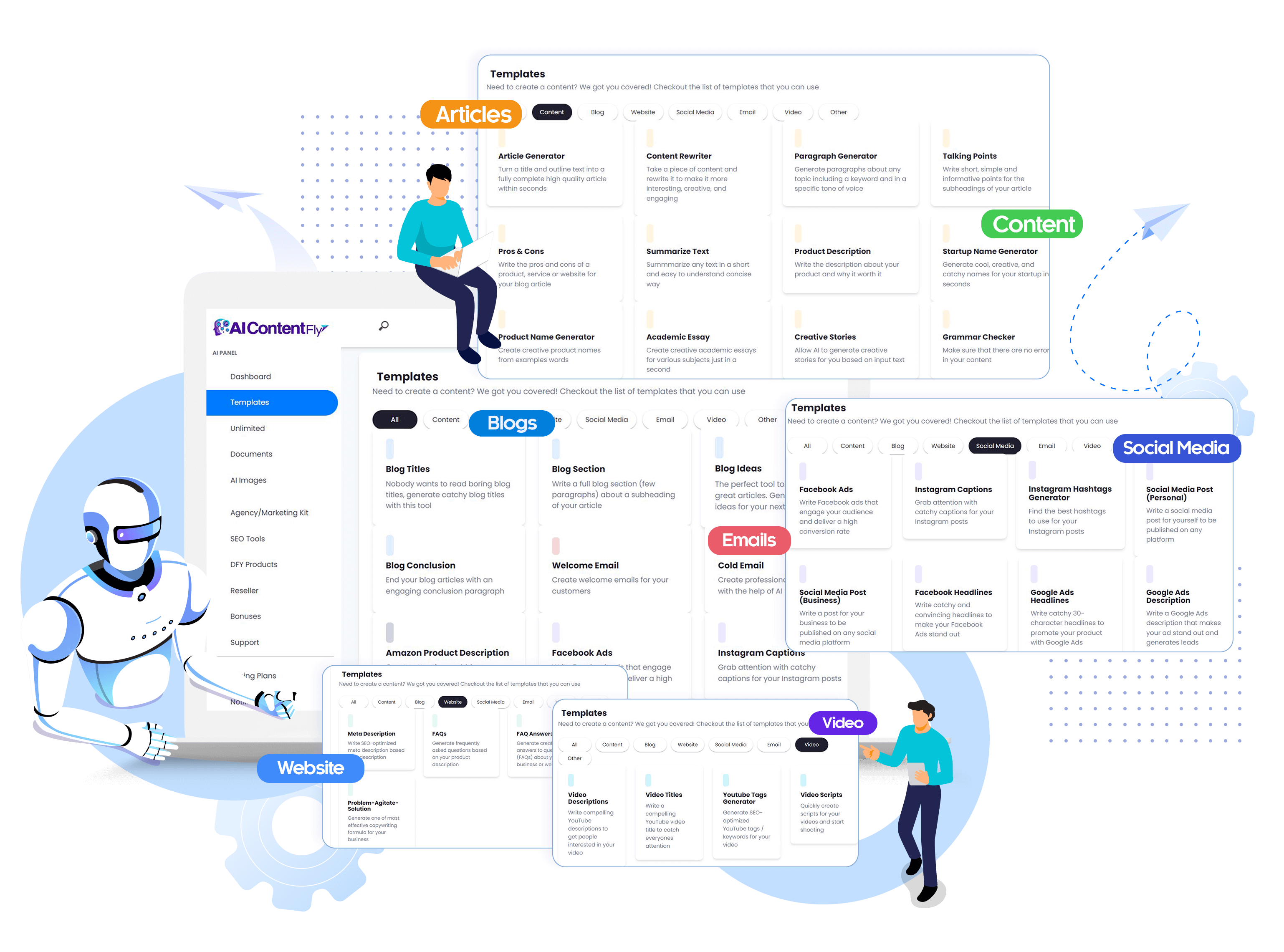 Choose From Our 39 Instant Content Templates – Blog Posts, Articles, Social Media Content, Welcome Emails, Product Descriptions, Summaries, Video Scripts and More.