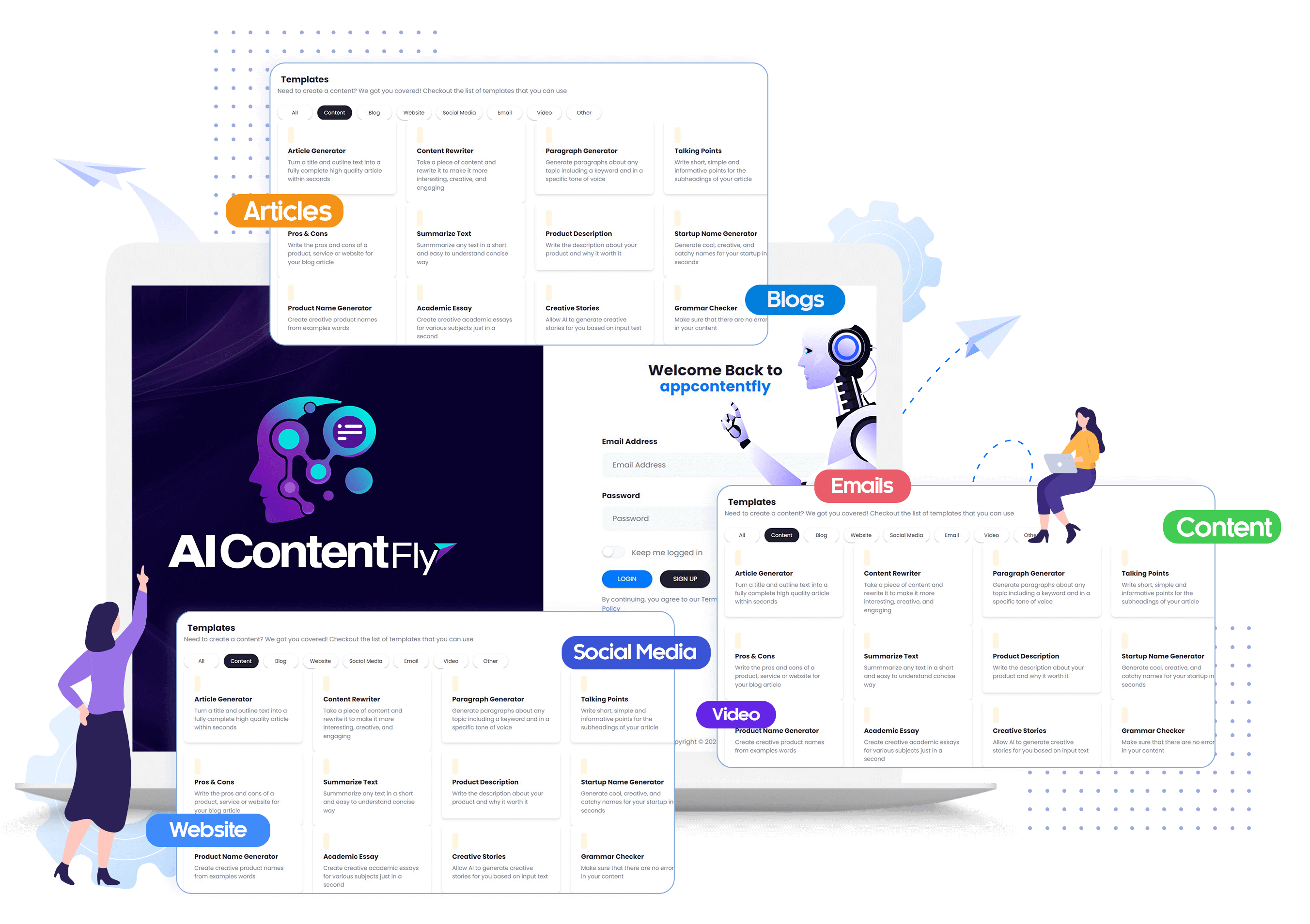 Choose From Our 39 Instant Content Templates – Blog Posts, Articles, Social Media Content, Welcome Emails, Product Descriptions, Summaries, Video Scripts and More.